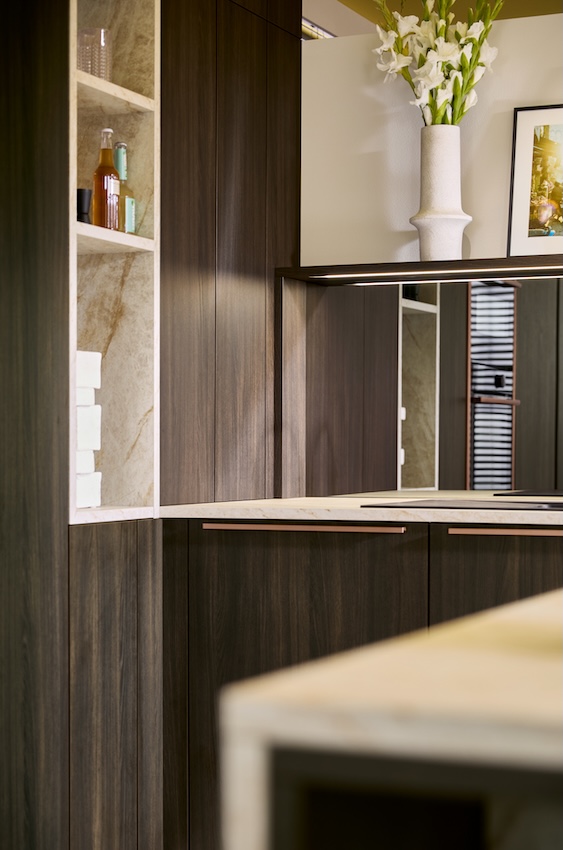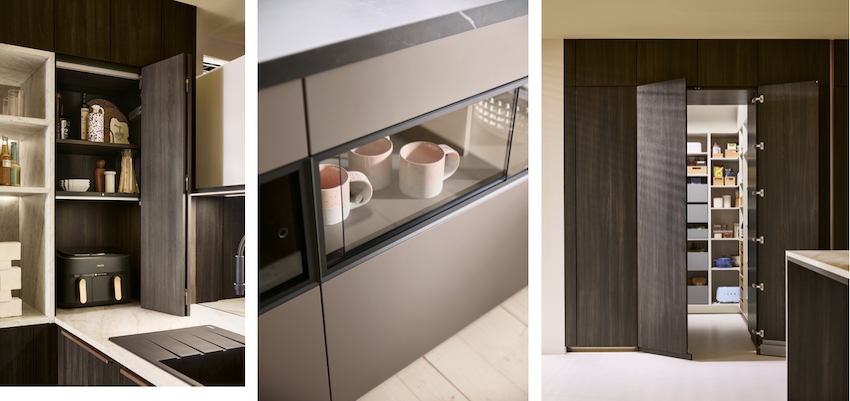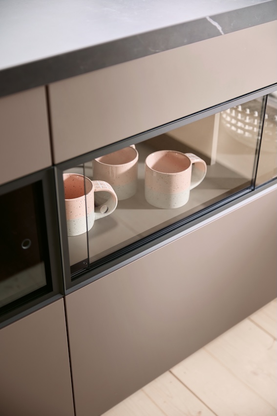 Les nouvelles étagères avec portes vitrées coulissantes permettent d’exposer avec élégance les verres à vin et la porcelaine, à l’abri de la poussière... mais pas des regards. La version en verre gris confère une touche de légèreté à la pièce, tout en conciliant fonctionnalité et esthétique. Intégrée dans l’élément haut ou l’îlot de cuisine, « sa conception transparente garantit une atmosphère ouverte et moderne, détaille Schüller. La cuisine dépasse ainsi le statut d'espace de travail strictement fonctionnel ; elle devient le lieu central de la pièce de vie, propice à la communication et à la convivialité. »