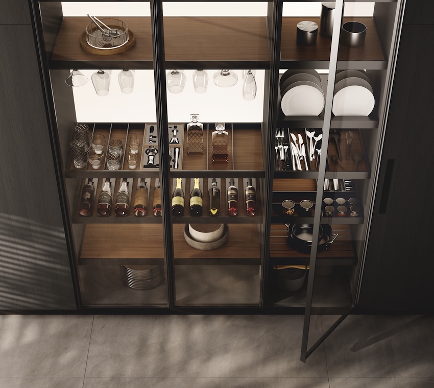 On remarque notamment les poignées agrémentant le modèle, qui ne sont pas de simples éléments fonctionnels mais deviennent de véritables traits distinctifs conférant du caractère à chaque composition ; disponibles dans de nombreuses variantes – saillante, intégrée dans la porte ou encastrée – et dans un choix riche de propositions satinées, peintes ou anodisées, « elles s’adaptent avec raffinement à toutes les exigences », à en croire le fabricant transalpin.